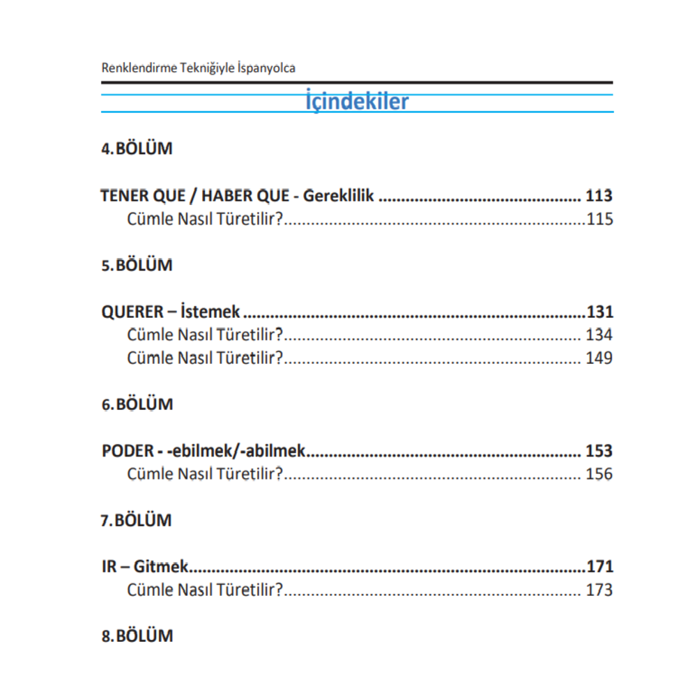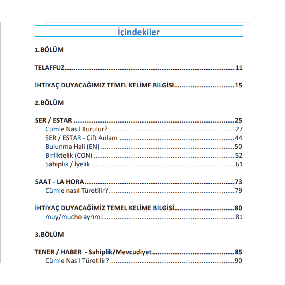 Kitabın amacı konuşma kabiliyeti kazandırmak olduğundan, kitap eylem bilgisi (olmak, istemek, yapmak, gelmek, gitmek, uyumak, çalışmak gibi) üzerinden ilerlemektedir.
